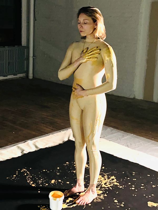 "Renaissance is a deeply intentional and spiritual piece that was rooted in a prayer for humanity. I chose to use gold paint on a black canvas to symbolize hope sprung from a dark place.